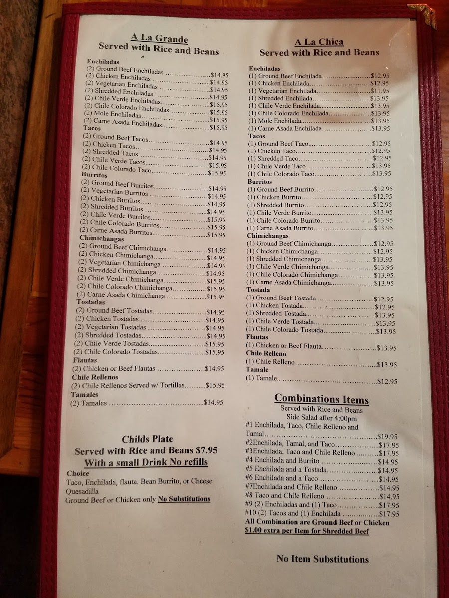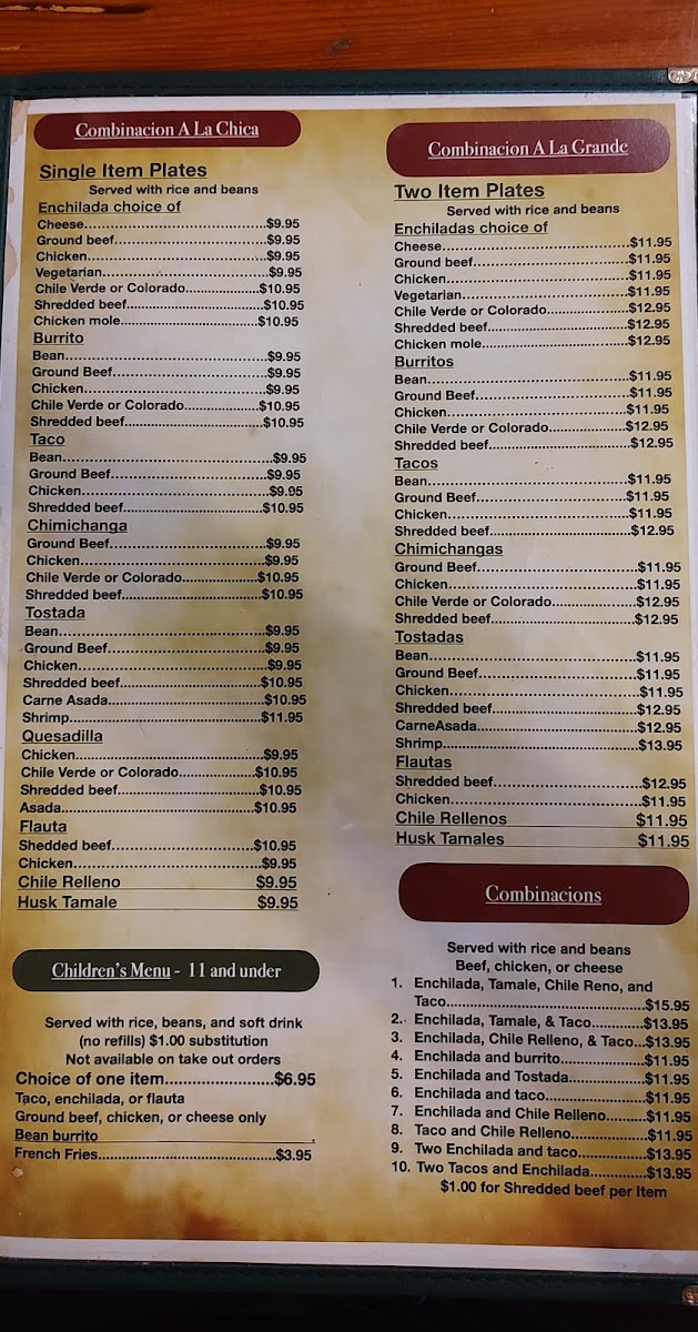The Combinations Items section includes delicious pairings such as the Tamal, and for those who want a variety of tastes, the Combinaciones feature combinations like Enchilada, Tamale, and Taco or Enchilada and Burrito, among others. The Enchilada and Tostada combo offers a great mix of flavors and textures.