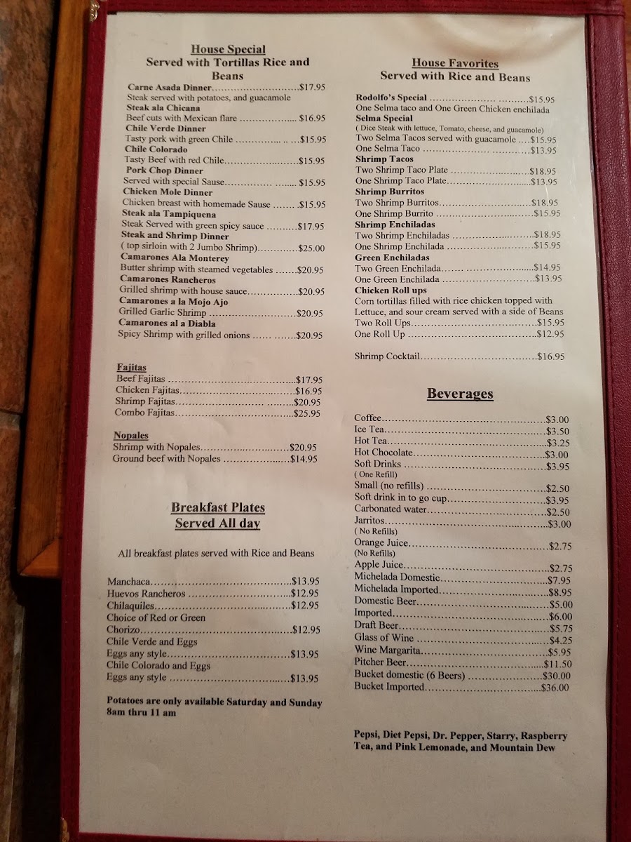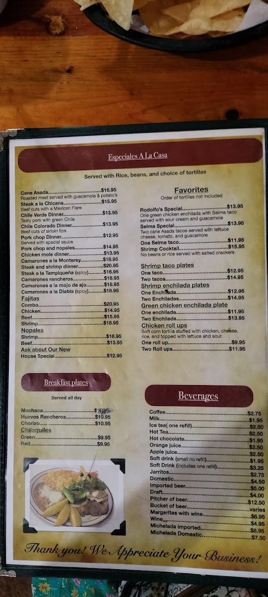 Rodolfo’s Especiales A La Casa offers some of the restaurant’s signature dishes, such as the Cane Asada and the flavorful Steak A La Chicana. The Chile Verde Dinner is a hearty, comforting dish perfect for those who love bold flavors. For those seeking something more familiar, the Favorites section offers a variety of beloved dishes, including the Rodolfo's Special and Selma Special, while the One Selma Taco provides a quick and satisfying bite. Additionally, the Shrimp Cocktail brings a refreshing seafood option to the table.